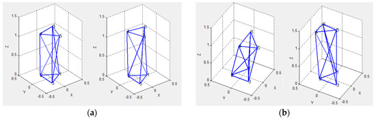 Symmetrical prestressable configurations of the left-handed tensegrity simplex are considered. The symmetrical configuration is commonly used in theoretical models of the simplex and it can be described by three variables, e.g.,: the radius or the side length of the triangles, the height denoting the distance between the horizontal triangles, and the twist angle between the projection of the line onto the horizontal plane and the -axis (Figure 1). The stable equilibrium configuration is for the angle and it is taken as the reference configuration. In the Cartesian coordinate system , with the origin at the center of the bottom triangle, we can identify coordinates of the nodes as: