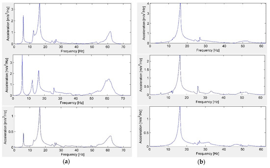 The acceleration in the frequency domain read from the 4th node at directions x (upper), y (central) and z (lower) for striking direction at azimuth: (a) 120 degrees and (b) 330 degrees.