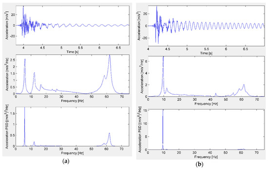 The acceleration in time domain, the acceleration in frequency domain, the power spectral density (PSD) of the acceleration in frequency domain of the signal 4x induced by the azimuth 240 degree impulse strike for: (a) the prestress level 4; (b) the prestress level 13.