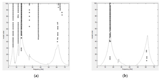 Although choosing the frequency and modes from the stabilization diagram is somehow arbitrary, as shown in an exemplary way in Figure 8, this issue is especially important for tensegrity structures, where the resonance spectrum often includes very closely situated frequencies. This is the case for frequencies around 16 Hz in Figure 8, which is a result of a high degree of a structure’s symmetry. Therefore, third flexural mode (Table 4) had very closely related double eigenmodes. These double natural modes are both presenting a flexural mode for different directions of vibrations. Hence, interferring natural frequencies can be an obstacle in recognizing the correct resonance and is susceptible to human error. The natural frequencies and modes are better or worse seen in the stabilization diagrams, which are subjected to the direction of the measured and induced signal (Figure 8). To find a certain type of mode, it is good to induce only this mode. Figure 8b presents finding only two modes, both of the rotational type, after inducing the impulse for the tangential direction. To find all modes of the structure, it may be good to induce generally more of them by applying a randomly directed signal, such as presented in Figure 8a in the direction of 120 degrees for node P4, wherein one can see at least five modes of the rotational and flexural type.