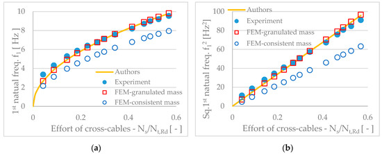 The effect of the prestress level on: (a) the first natural frequency; (b) the square of the first natural frequency.