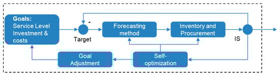 - System theory and cybernetics: from the historical development point of view, cybernetics can be considered as part of the system theory. Both sciences deal essentially with the same subject, so they can be difficult to separate from each other. However, the focus of system theory is on the development of systems, whereas cybernetics explores the control and operation of systems [37]. In this context, cybernetics is used as a basis for the conceptual model, as shown in Figure 1. In the beginning, based on a set of goals defined by the observer as an interactive agent, a forecasting method is selected. Then, the forecast of future demand is the input for the inventory and procurement planning. Later, the results are obtained, and, by comparing them with the goals, a self-optimization is performed by deciding to maintain or change the forecasting method, the inventory safety factors, and the order release point as well as the procurement policy to be applied. Finally, by doing so, the system converges to a defined set of goals with a feedback control loop each period or planning period.