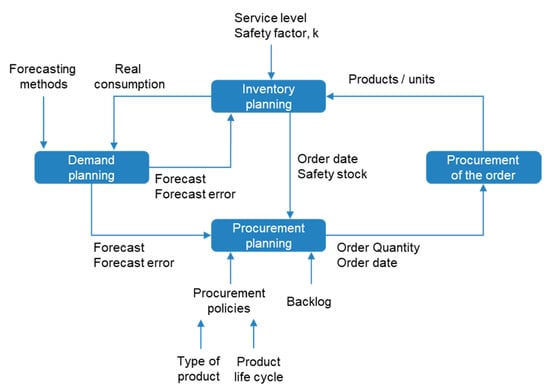 This approach requires transparency and data sharing between actors in the supply chain to improve the customer service level while minimizing inventory management costs. The conceptual model is based on the following Figure 2. Demand planning depends on historical data and on the forecasting methods available and the one selected to be used. With the difference between real and forecast values, the forecast error is obtained. Based on the forecast values and the forecast error, the safety factor, k and the order release date for procurement orders are set for a defined service level. The procurement policy is determined based on the inputs from demand planning and inventory planning when considering the current delivery backlogs and the selected procurement policy. The procurement policy is selected as influenced by the type of product and the type and stage of the product lifecycle. Finally, procurement planning using a defined policy initiates the procurement of products by placing procurement orders. When the products arrive, the inventory management conceptual model finishes and repeats continuously.