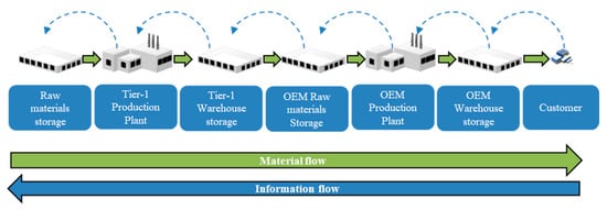 Second, the supply chain structure is set to apply the conceptual model and to be able to simulate it under certain conditions. The structure consists of a Tier 1 supplier and an OEM Producer as shown in Figure 3. The hierarchical supplier network is divided into three tiers, with the Tier 1 suppliers as producers of completed modules (e.g., dashboard, engine, seats, etc.) with their own manufacturing capabilities or montage [53]. Both have their warehouses of raw materials and finished products in addition to their production facilities. Finally, end-customers are at the end of the chain receiving the products: