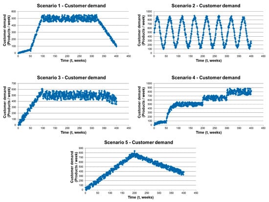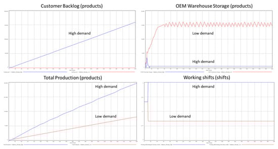 First, the modeler must define a time horizon and units of time. It is easy to conduct this step by asking to what extent the simulation should be considered. In the case of this study, we decided to simulate eight working years to evaluate the influences in the short, medium, and long term. The simulation was performed with 400 time periods, each representing one producing week, counting a total of eight years of production, which represents the lifecycle of the product in consideration. The lifetime of car models in the past decade in the more advanced countries decreased on average from eight to almost four years [52].