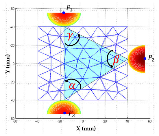 In fact, a 3-fingered grasp is more reliable in terms of stability, slip avoidance, and balance of forces when it converges towards an ideal equilateral grasp [17]. Thus, each three-fingered grasp can be characterized by a value which represents its similarity to an equilateral triangle. We suggest an algorithm based on geometric criteria to find this equilateral grasp. This algorithm determines, at first, the set of all possible grasping triangles by scanning the points belonging to the contact surface . Then, using the criterion presented by Roa [17], our algorithm compares the angle values (alpha, beta, and lambda) of these triangles with (i.e., the angle that characterizes an equilateral triangle) in order to choose the configuration closest to an equilateral triangle (see Figure 2):