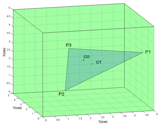 For evaluating the angles of the triangle, we use a margin of error defined by the interval [0, 0.3]. Depending on the density of the points of the contact surface , this algorithm can give several grasp configurations. Finally, a second criterion, referred to as , is used in order to choose one between them. It measures the distance between the center of the mass of the object and the center of the grasping triangle (Figure 3), defined as