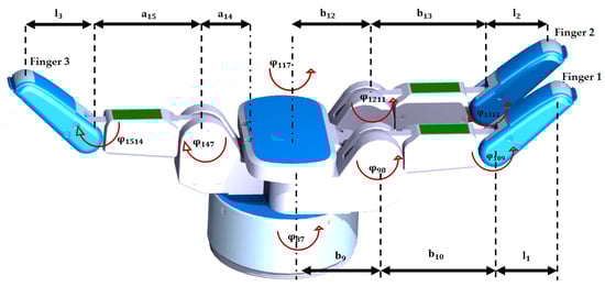 In this section, we present the pregrasp strategy for reaching the three contact points of the initial grasp computed in Section 3 with a three-fingered robotic hand (e.g., the Barrett hand [50] in our experiments). In order to describe the kinematic model of the Barrett hand, we establish the joint frames of Figure 4. The movement of the fingers of the Barrett hand is controlled by defining 4 encoder values that are connected to the joint values of the fingers (Figure 4) by the following coupling relationships: