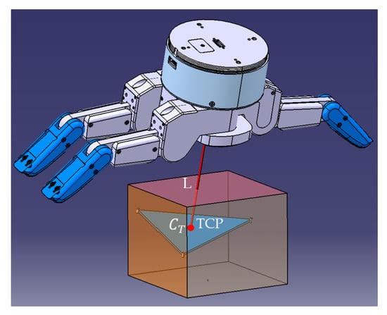 Firstly, we want to reach the relative object + hand configuration of Figure 8, which consists of putting the TCP in coincidence with (see Figure 9b). Then, we use the results from Section 3 to determine the contact points. We calculate the grasp triangle formed by these three contact points as well as its centroid . Finally, we define the final pregrasp configuration (defined in Figure 5) by the translation and orientation of the hand. This step consists of matching the two TCP and points and aligning the Z axis of the TCP coordinate system perpendicular to the grasp triangle (see Figure 9c) by computing the arm movements required to reach the tool frame obtained by Algorithm 2. When this final pregrasp configuration is reached by the hand, the fingers will be closed by applying the joints’ angles obtained with Algorithm 2. An example of the main execution steps of this pregrasp strategy for a cube is shown in Figure 9.