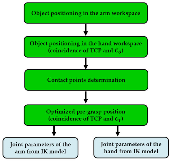 After establishing the initial grasp points of the fingers (Section 3) and the corresponding pregrasp configuration of the hand around the object (Section 4), we should execute the latter by moving the hand with a robotic arm that carries it. Figure 6 shows the flowchart of the pregrasp strategy for the hand + arm system that uses the IK of the arm and the hand for achieving this initial grasp. For implementing this planning strategy, we have chosen a 6-DOF robotic arm (e.g., a Viper S1700D for our real experiments) so that the hand can attain any pose (position + orientation) in the space around the object. Initially, the object is resting on a table, modeled by a plane parallel to the XY plane of the arm base.