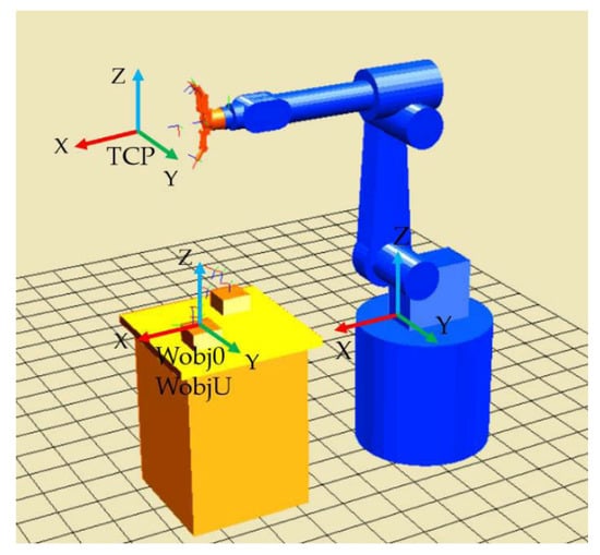 For performing this pregrasp strategy, we should represent the object pose (position in mm and orientation in ZYZ Euler angles) from its original frame (object mark) to the frame (user mark), known by the arm (see Figure 7). The TCP pose will also be represented firstly in the frame in order to easily define relative movements between the object and the hand. Later, it will be transformed into the arm frame () so that final movements of the arm can be computed.