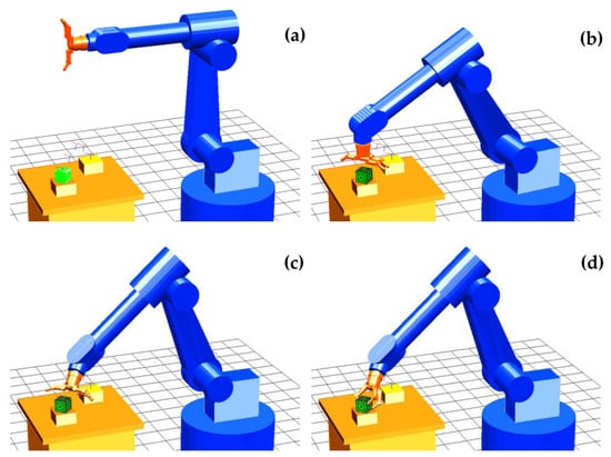 Main execution steps of the pregrasp strategy for the hand + arm system in order to grasp a cube: (a) initial robot–object configuration, (b) reaching trajectory (intersection of TCP and ), (c) hand orientation (intersection of TCP and ), (d) pregrasp configuration.