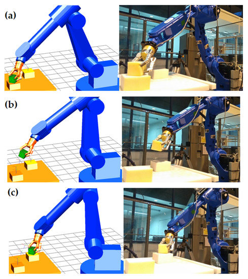 Pick-and-place of the cube by the Adept robot and the Barrett hand: (a) grasping, (b) lifting, and (c) leaving.