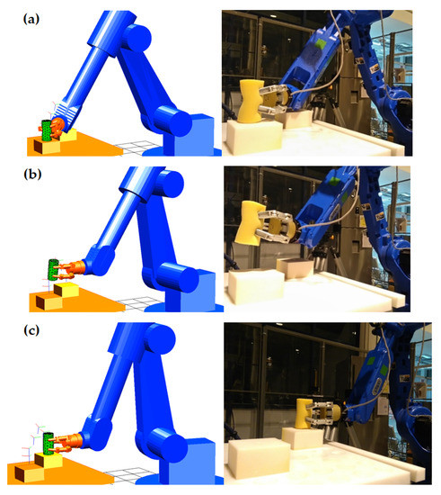 The relation between these force thresholds and penetration of the fingers inside the object (i.e., the deformation of its surface) is obtained by the simulation of the contact interaction model while closing the fingertips over the object. The real relation force–penetration is very similar to the one computed in the simulation (see real validation experiments in [33]). Thereby, our strategy of applying the contact forces obtained from simulation in real grasping is suitable. In fact, the mean error of the contact force obtained by our model is of , which implies that only of typical contact forces is required for grasping most common life deformable objects. In addition, the nonlinear relation force–penetration shows that simplified linear models cannot be used for grasping significantly deformable objects and justifies the necessity of the proposed model. The proposed grasp planning strategy is validated by the correct execution of two pick-and-place tasks (for a cube and a cylinder): lifting and stable transportation of both objects with the real robot without any slippage (as shown in the real photographs of Figure 11 and Figure 12).