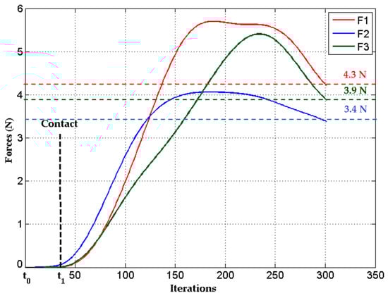 The second step is to model the interaction between the fingers and the object for closing the fingers against the object surface in order to get the required contact forces in simulation (as explained in Section 6). The real contact forces at each finger are obtained by strain gauges installed in the phalanxes of the Barrett hand. Thereby, the Barrett hand is iteratively closed until the contact forces obtained from the simulation of the contact model are attained (as shown in Figure 13). Thus, a stable final grasp of the deformable object is obtained and the object can be lifted without any danger of falling down. Figure 13 shows the variation in the norm of the three forces applied to the cube during the simulation of the contact model. At the initial step () of the simulation, the fingers move towards the object in order to reach the initial contact points. When the fingers come into contact with the object (), the contact model starts to evaluate the applied forces. This figure also shows that the contact forces are continuous and directly related to the amount of local deformation inside the contact area. The fingers continue to apply forces until equilibrium conditions are satisfied (i.e., reaching the three fingers’ contact forces thresholds, identified by horizontal dashed lines in Figure 13). Once this state is reached and the three force thresholds are obtained, the fingers should keep these contact forces in order to ensure stable handling and then the simulation can stop.