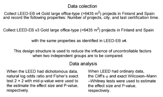 The achieved credits of LEED-EB v3 and v4 Gold projects were collected from the USGBC office site [25], while space types and project sizes were collected from the Green Building Information Gateway (GBIG) global platform [26]. The USGBC and GBIG databases discovered 14 LEED v4 Gold large office-type (>6435 m2) projects in Finland and 16 in Spain. Furthermore, the following properties were recorded: the number of projects, the city, and the last certification time [25,26]. Based on the USGBC and GBIG databases, we collected the same number of LEED-EB v3 large office-type (>6435 m2) projects with the same properties, as identified in LEED-EB v4 [25,26]. This design structure was used to reduce the influence of uncontrollable factors when two independent groups were to be compared [27,28]. Table 1 demonstrates that, for both versions, the differences between building sizes certified in Finland and Spain seemed to be negative. Table 2 shows that versions 3 and 4 of the LEED-EB Gold projects showed a similar distribution among cities in Finland and Spain.