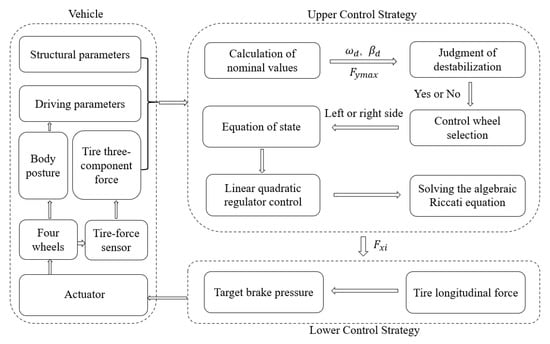 Different from the traditional ESC control strategy, this paper designs a controller based on optimal linear control, and proposes an ESC control strategy based on tire force observation control, in order to be able to use with tire force sensor to improve the control accuracy of the electronic stability control system. First, in the nominal value calculation part, the influence of the maximum lateral force of the tire under extreme conditions by the longitudinal force is considered, and the expected value of the control index is determined according to the road surface information, the vehicle state information, and the measured tire force. After that, based on the nominal and actual values of the control indicators that determine the vehicle’s instability state, if the vehicle is determined to be unstable, the controller will be triggered to work. Next, after the vehicle is determined to be unstable, the upper controller determines the tires to be braked according to the control command. Vehicle state controller outputs target longitudinal force based on desired state. What’s more, the lower controller determines the braking pressure applied to the target wheel based on the target longitudinal force. At last, spoke-type three-component force sensor detects the force of the controlled tire in real time and serves as input to the controller, making the system a closed loop. The controller structure is shown in Figure 3.
