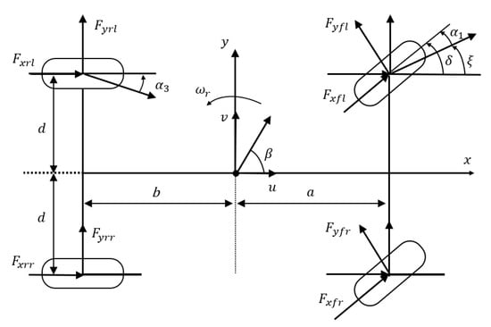 Inside, is the longitudinal force on the right front wheel; is the longitudinal force on the right rear wheel; is the lateral force on the left front wheel; is the lateral force on the right front wheel; is the lateral force on the left rear wheel; is the lateral force on the right rear wheel; is the half of wheelbase.