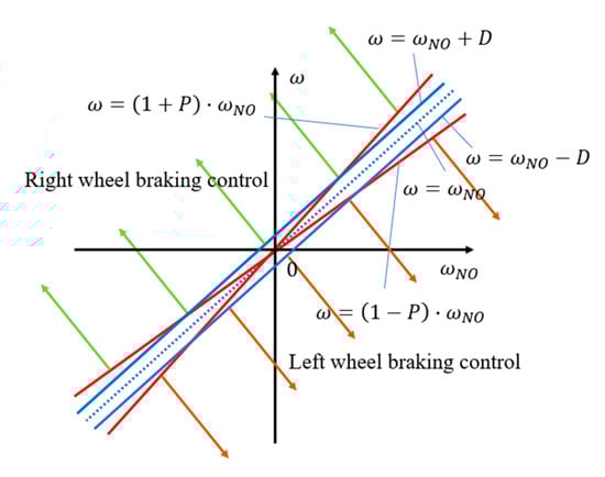 The switching logic of the left and right sides wheel braking control. As shown in Figure 5, the ordinate of the coordinate system is and the abscissa is . The red line is determined by the formula , the blue line is determined by the formula , and the blue dotted line distinguishes the area where the left and right wheels brake when there is no brake switching logic. Therefore, unilateral braking needs to be performed in areas where the red line and blue line are unexpected, and the controller does not work in the inner area. Obviously, whether it is switching from the left braking control to the right braking control or from the right braking control to the left braking control, it will pass through an area where the controller does not work.