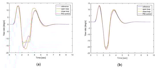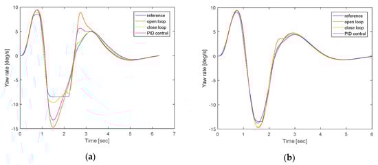 Comparison of yaw rate at 80 km/h with a coefficient of adhesion of 0.5 and 0.8. (a,b) reflect the nominal yaw rate, and yaw rate of three control methods at a speed of 80 km/h on a pavement with a pavement adhesion coefficient of 0.5 and 0.8.