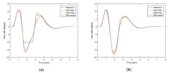 The yaw rate graphs of the vehicle model based on traditional PID control when = 0.5. (a,b) are the nominal yaw rate and actual yaw rate of the vehicle model using traditional PID control when the road adhesion coefficient is 0.5.