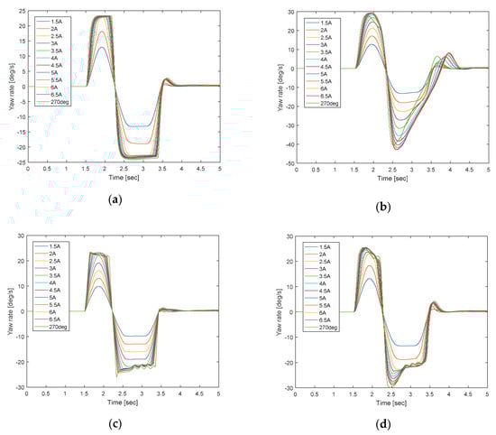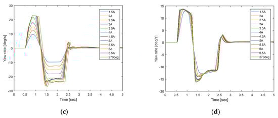 Yaw rate with a friction coefficient of 0.8 in the sine with dwell condition. (a–d) show the nominal yaw rate, open-loop control yaw rate, PID control yaw rate and closed-loop control yaw rate plots for the sine with dwell condition on a pavement with an adhesion factor of 0.8.