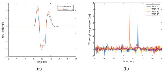 Test results based on the tire force observation controller at = 80 km/h and = 0.8. (a) is a comparison of the nominal and actual values of the yaw rate, and (b) is the wheel cylinder pressure value collected from the wheel cylinder pressure sensor.
