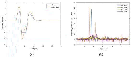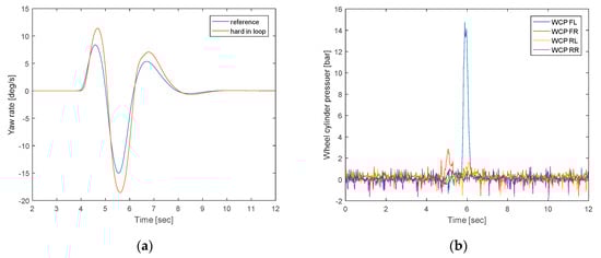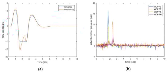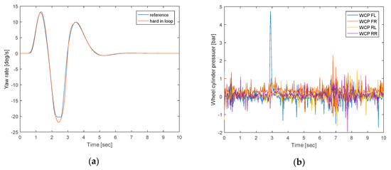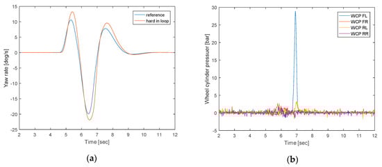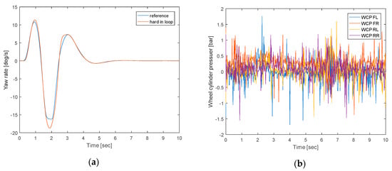 Test results based on the tire force observation controller at = 80 km/h and = 0.5. (a) is a comparison of the nominal and actual values of the yaw rate, and (b) is the wheel cylinder pressure value collected from the wheel cylinder pressure sensor.