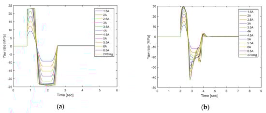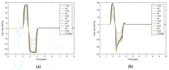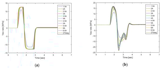 The sine with dwell (SWD) simulation test follows the standard FMVSS 126 requirements to set up the simulation conditions. According to the simulation of the vehicle model used to obtain A = 13 deg. At a speed of 80 km/h on the road surface adhesion coefficient of 0.5 and 0.8 on the test, each condition was drawn to 1.5 A, 2 A, 2.5 A, …, 6.5 A and 270 deg as the maximum values of the yaw rate for the sinusoidal steer angle.