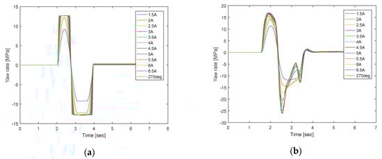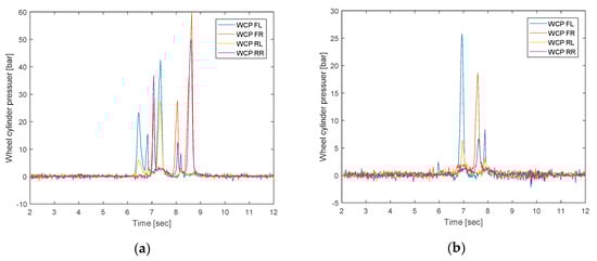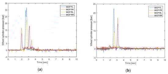 Based on the traditional PID control, the brake wheel cylinder pressure value under the test condition of the maximum steering angle is shown. (a,b) are the brake wheel cylinder pressure values of the vehicle model using traditional PID control when the maximum steering angle is 270 deg and the road adhesion coefficient is 0.5 and 0.8.