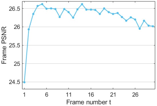 With the rise of deep learning, video super-resolution has received significant attention from the research community over the past few years. The sliding window method and recurrent method are two of the latest state-of-the-art methods based on deep learning. Specifically, the sliding window video super-resolution (SWVSR) method solves this problem by combining a batch of low-resolution images to reconstruct a single high-resolution frame and divides the video super-resolution task into multiple independent super-resolution subtasks []. Each input frame is processed several times, which wastes calculations. In addition, the generation process is an independent subtask, which may reduce time consistency, resulting in flickering and artifacts. Unlike the SWVSR method, the recurrent video super-resolution (RVSR) method generates the current high-resolution image from the previous high-resolution image, the previous low-resolution image, and the current low-resolution image [,]. Each input frame is processed once. The RVSR method is able to process video sequences of any length and enables the details of the video to be implicitly transmitted in longer video sequences. Insufficient use of information caused by the RVSR method leads to a correlation between image quality and time (as shown in Figure 1).
