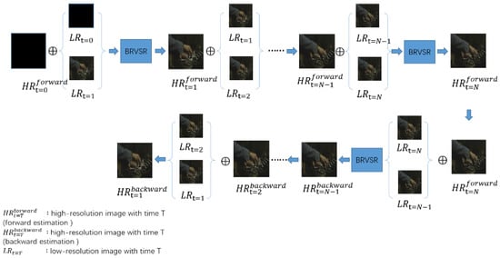 Overview of the proposed bidirectional frame recurrent video super-resolution (BFRVSR) framework. N frames are input as a group. In the group, each input is two frames of low-resolution and one frame of high-resolution, and the output is one frame of high-resolution. Forward estimation generates N frames of high resolution. Reverse estimation generates N − 1 frames of high resolution.