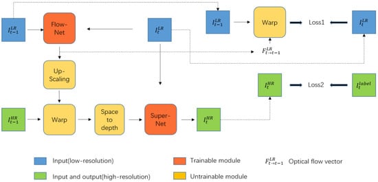 The proposed model is shown in Figure 3. Trainable modules include the optical flow estimation network, i.e., FlowNet and the super-resolution network, i.e., SuperNet. The input of our model is the low-resolution image of the current frame , the low-resolution image of the previous frame , and the high-resolution image estimation of the previous frame . The output of our model is the high-resolution image estimation of the previous frame .
