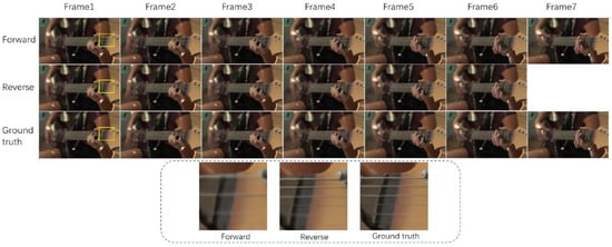RVSR can be trained on video clips of any length. However, if the video clip is too long, RVSR has a problem which is the correlation between image quality and time. In fact, RVSR also has the problem on shorter video clips. BFRVSR solves this problem, as shown in Figure 7. BFRVSR has two processes, i.e., forward estimation and reverse estimation. is used to transmit global information and perform timing alignment operations. In the forward estimation, BFRVSR is equivalent to RVSR. The problem in forward estimation is obvious. When the generated video sequence is , the reference information generated by the forward estimation of is , not global information. Reverse estimation solves this problem. Reverse estimation makes each frame implicitly use all global information to estimate the high-resolution image of the frame by using to generate . As shown in Figure 8, the result of reverse estimation is better than result of forward estimation.