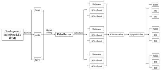 The leaves were harvested from DM grown on Jeju Island for 10 years. The harvest period was sampled three times in May, August, and November. The leaves were dried at 50 °C for 15 h. The fraction solvents were hot water, 30% ethanol, and 60% ethanol. Water extraction was conducted in a water bath at 85 °C for 3 h. In addition, the leaf extracts were prepared using 30% and 60% ethanol for 4 h at 75 and 70 °C, respectively. After concentration under reduced pressure, lyophilization was conducted. The extraction progress is displayed in Figure 1.