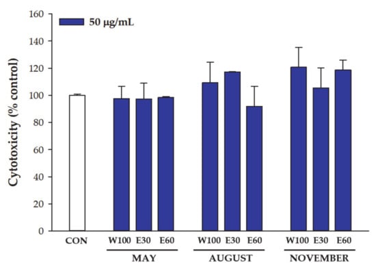 Most chronic diseases are initiated by imbalances in major overarching processes, such as oxidative stress, metabolic stress, psychological stress, and inflammatory stress []. Plant food containing various secondary metabolites has been proposed to display anti-inflammatory responses []. Therefore, this study investigated the anti-inflammatory effect of various DM extracts according to seasonal variation and different ethanol concentrations as a solvent using the RAW264.7 murine macrophage cell line stimulated with LPS. DM leaves were harvested in May, August, and November, and each leaf sample was extracted using aqueous ethanol solutions (0, 30, and 60%). In the cytotoxicity assay, most extracts displayed cell viability close to that of the control group in 50 μg/mL, except for a few extracts. The hot water and 30% ethanol extracts harvested in August and all extracts harvested in November showed a higher cell viability than the control group. Previous studies have reported that plant extracts can enhance cell proliferation and increase the cell viability []. Likewise, hot water and 30% ethanol extracts harvested in August and all extracts harvested in November could have potential which increases cells. Except for a few extracts, most DM extracts showed lower inflammatory responses in LPS-stimulated RAW264.7 cells relative to LPS-treated cells. Among the extracts, the 30% ethanol extract harvested in May and 60% ethanol extracts harvested in August and November exhibited prominent inhibitory activity. This inhibition was almost close to the normal control cell level. Sometimes, the inflammatory reaction increased at a low concentration (12.5 μg/mL). Unlike human and in vivo studies, inflammation could be excessively induced in an in vitro study, as plants contain various phytochemicals and interact with each other [,,]. Furthermore, this study was primarily based on cell viability data, and anti-inflammatory effects were revealed at a high concentration (50 μg/mL). Although identifying the principal bioactive components is a theoretically simple process to design, the actual discovery of the active compound may be considerably delayed, given that multiple metabolic pathways are involved in the plant physiology []. Therefore, further research should be conducted to determine what causes increased inflammation in a low concentration sample group compared to an LPS-treated group.