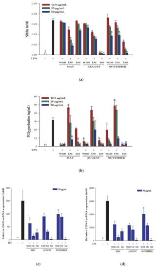 Before the quantification of proinflammatory compounds, the cytotoxicity of RAW264.7 cells treated with various DM extracts was tested (Figure 2). When DM extracts were treated at concentrations of 50, 100, 250, and 500 μg/mL for all extracts, cytotoxicity was not observed in 50 μg/mL of all extracts. The DM extracts harvested in May showed approximately 98% cell viability for all extracts. In DM extract groups harvested in August, the cell viability was high, in the order of the 30% ethanol extract > hot water extract >60% ethanol extract. The DM extracts harvested in November showed a higher cell viability in hot water and the 60% ethanol extract than in the 30% ethanol extract. Therefore, all DM extracts of 50 μg/mL were considered non-toxic, like the control group. Based on the cytotoxicity test results, optimal and physiological attainable concentrations of DM extracts (12.5, 25, and 50 μg/mL) were selected for further experiments. To confirm the anti-inflammatory effects, nitrite and PGE2 levels in RAW264.7 cells treated with various DM extracts were quantified. The DM extracts expectedly decreased the nitrite level in 50 μg/mL of extracts, regardless of solvents and seasons, except for hot water extracts obtained in May. Sometimes, a nitrite increase was observed in 12.5 μg/mL of the hot water extract harvested in November compared to the LPS-treated group (Figure 3a). The 30% ethanol extract harvested in May and August and the 60% ethanol extract harvested in August and November displayed dose-dependent inhibitory effects. Similarly, the PGE2 level also declined in all 50 μg/mL extracts except for the 30% ethanol extract harvested in August. Sometimes, 12.5 or/and 25 μg/mL of 30% ethanol extracts harvested in all seasons exhibited increased PGE2 production compared to the LPS-treated group (Figure 3b). Of note, all extracts obtained with hot water and 60% ethanol harvested in all seasons significantly inhibited inflammatory responses. Compared to control cells, 60% ethanol extracts harvested in August and November decreased both nitrite and PGE2 levels to normal control levels. When the concentration of the sample was set at 50 μg/mL, 60% ethanol extracts harvested in August and November showed the most prominent inhibitory activity. To prove a decreasing trend for nitrite and PGE2 levels, the mRNA expression of downstream elements was also quantified. When iNOS and COX-2 mRNA levels were analyzed in RAW264.7 cells treated with LPS and each extract at 50 μg/mL, the treated cells displayed significantly decreased mRNA expression levels of iNOS and COX-2 (p < 0.05 for all treated samples; Figure 3c,d). In a group treated with extracts harvested in May, the mRNA expression levels of iNOS and COX-2 were lower in the 30% ethanol extract group than in the 60% ethanol extract group. All DM extracts inhibited the mRNA levels of iNOS and COX-2 compared with the LPS-treated group. Among various extracts, 60% ethanol extracts harvested in August and November decreased the values to those of normal control cells and showed the most prominent decreasing capability.
