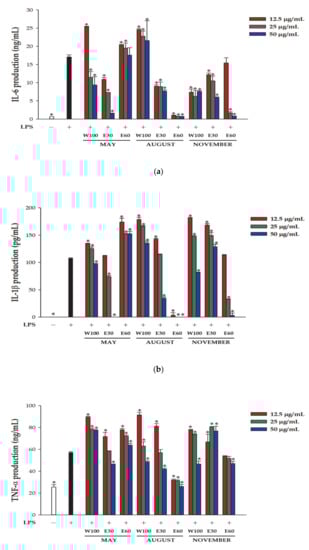 Proinflammatory cytokines (IL-6, IL-1β, and TNF-α) that play an important role in the defense against pathogen invasion were measured. As shown in Figure 3, the concentration of cytokines was higher in the LPS groups than in the control group. The DM extracts (25 and 50 μg/mL) prepared with hot water and 30% ethanol harvested in May, 30% and 60% ethanol harvested in August, and all extracts harvested in November exhibited significant inhibitory activity for the production of IL-6 (p < 0.05) (Figure 4a). In addition, these extracts also displayed an anti-inflammatory effect at 12.5 μg/mL, except for the 60% ethanol extract harvested in November. However, several extracts, including the 12.5 or/and 25 μg/mL of hot water and 60% ethanol harvested in May and hot water extract (all concentrations) harvested in August, showed an increase in the IL-6 level compared to LPS-treated group. In terms of IL-1β production, 50 μg/mL of DM extracts, except for 60% ethanol harvested in May, hot water harvested in August, and 30% ethanol harvested in November, showed a significantly suppressed IL-1β level compared to the LPS-treated group (Figure 4b). The production of IL-1β was higher in hot water (12.5 and 25 μg/mL) and 60% ethanol (all concentrations) extracts harvested in May, hot water (all concentrations) and 30% ethanol (12.5 μg/mL) extracts harvested in August, and hot water (12.5 and 25 μg/mL) and 30% ethanol (all concentrations) extracts harvested in November than in LPS-treated cells. The TNF-α level decreased in 50 μg/mL of the 30% ethanol extract harvested in May, all extracts harvested in August, and hot water and 60% ethanol extracts harvested in November (Figure 4c). Partially, some extracts, such as hot water (all concentrations), 30% ethanol (12.5 μg/mL), and 60% ethanol (all concentrations) extracts harvested in May; hot water (12.5 and 25 μg/mL) and 30% ethanol (12.5 μg/mL) extracts harvested in August; and hot water (12.5 and 25 μg/mL) and 30% ethanol (all concentrations) extracts harvested in November, showed a considerable induction of TNF-α compared to that in the LPS-treated group. Among the extracts, the 60% ethanol extract harvested in August displayed the most prominent inhibitory activity. This extract inhibited proinflammatory cytokine production close to normal levels, even at the lowest concentrations (12.5 μg/mL).