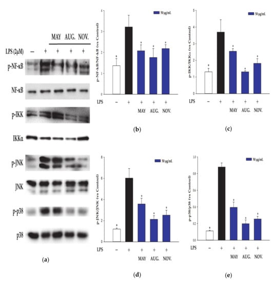 The pretreatment with DM extracts significantly inhibited the production of nitrite and PGE2, mRNA expression level of iNOS and COX-2, and inflammatory cytokines level. To clarify the mechanism underlying the inhibition of inflammatory responses, regulation of the NF-κB and MAPK signaling pathway was demonstrated using the extracts showing the highest anti-inflammatory activities (Figure 5), namely the 30% ethanol extract in May and 60% ethanol extracts in August and November (Figure 3c,d). The NF-κB signaling pathway can be initiated by an external stimulus. The phosphorylation and successive proteasomal degradation of IκB are essential for classical activation []. The inhibitory κB kinase (IKK) complex phosphorylates and degrades IκB, resulting in the translocation of NF- κB to the nucleus. MAPK is involved in a wide range of signaling pathways, which are activated by various extracellular stimuli []. JNK, p38, and extracellular signal-regulated kinases (ERK) are included in the MAPK pathway. The LPS-treated group exhibited an increased phosphorylation of NF-κB, IKK, JNK, and p38. NF-κB phosphorylation was approximately 1.5, 1.8, and 1.5 times lower in the group treated with the extract from May, August, and November than in the group treated with LPS alone (p < 0.05). IKKα phosphorylation was approximately 1.5, 2.8, and 2 times lower in the group treated with the extract from May, August, and November than in the group treated with LPS alone (p < 0.05). JNK phosphorylation was approximately 1.7, 2.8, and 2.4 times lower in the group treated with the extract from May, August, and November than in the group treated with LPS alone (p < 0.05). The phosphorylation of p38 was approximately 2.2, 4.5, and 3.5 times lower in the group treated with the extract from May, August, and November than in the group treated with LPS alone (p < 0.05). All DM extracts significantly inhibited phosphorylation of the NF-κB signaling pathway-related protein. Among the extracts, the extract from August displayed the most prominent regulation ability.