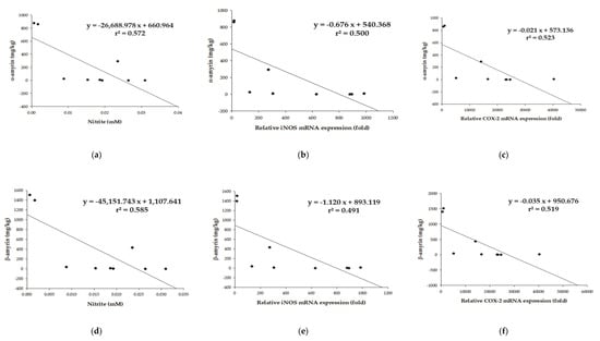 Relationship between amyrin and inflammation regulators. Correlations are presented as Pearson´s correlation coefficient (r2). The correlation between a-amyrin and nitrite (a), and the relative mRNA expression levels of inducible nitric oxide synthase (iNOS) (b) and cyclooxygenase-2 (COX-2) (c). The correlation between β-amyrin and nitrite (d), and the relative mRNA expression levels of iNOS (e) and COX-2 (f).