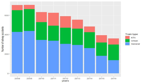 Figure 1, the number of accidents over the years were compared by the railroad types (KTX, Urban and General) and it was found that general railway-related accidents dramatically decreased from 2008 to 2016, compared with other train types.