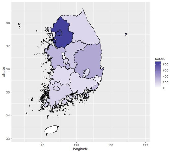 Figure 2 shows the map of the number of railway accidents in 17 provinces of South Korea. There were 892 accidents in Seoul, the capital of South Korea within the study period and 857 accidents in Gyeonggi province, the area surrounding the capital. Thus, the total number of railway accidents in Seoul and Gyeonggi province was 1749, which is about 34.6% of all accidents. The frequencies of all KTX and the majority of urban railway lines have increased dramatically in this area in order to meet the rising travel demand. As a result, train accidents are concentrated, mainly in the metropolitan area. Therefore, it can be concluded that the number of accidents escalate with rise in train frequency.