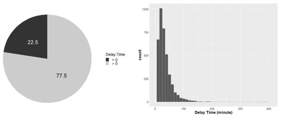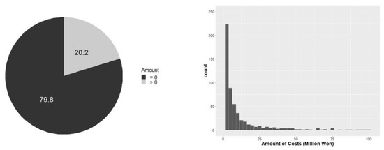 Figure 4, 22.5% (1139) and 79.8% (4029) of the sample size were recorded as no time delay and no cost, respectively. The histograms in the figures show that the positive measurements for each variable are extremely right-skewed and, thus we considered the gamma distribution and the log-normal distribution as good fits. The five-number summary (minimum, 25th percentile, median, 75th percentile, maximum) for delay time is (0, 10, 22, 37 and 1432). For the positive measurements (20.2%) of the cost amount, the five-number summary is expressed as (0.001, 0.434, 1.724, 6.6 and 13,933). No probability distribution of positive real-value random variables includes zero as one of the possible realizations. Therefore, TPMs for semi-continuous data are essential to build both logit part for zero measurements and the gamma (or log-normal) part for non-zero (or positive) measurements.