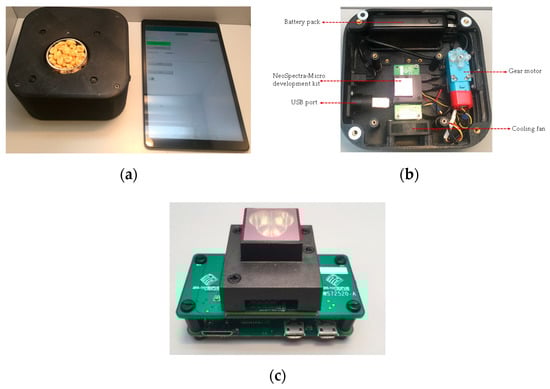 The novel handheld Fourier Transform near-infrared (FT-NIR) spectral sensor prototype used to analyze breakfast cereal samples (a), the inner section of the handheld FT-NIR spectral sensor prototype (b), and the NeoSpectra-Micro development kit (c).