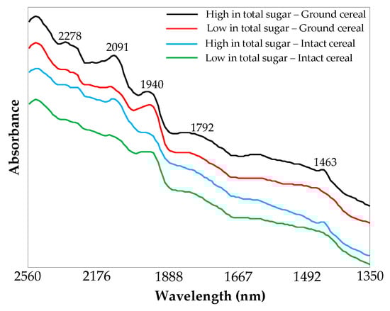 Examples of NIR spectra obtained from the ground and intact breakfast cereal samples are shown in Figure 2. These spectra show evidence of characteristic absorption bands of various vibrational modes, which are identified based on the prior studies in the literature [,,,]. The prominent absorption bands in the NIR spectra are centered at 2278, 2091, 1940, 1792, and 1463 nm (Figure 2). In particular, the bands at 2278 nm and 2091 nm correspond to aliphatic C–H bonds of carbohydrates and O–H fundamental vibrations, respectively, which are associated with crystalline sugar, particularly sucrose. The band at 1940 nm corresponds to a combination of O–H bending and stretching, while the bands near 1792 nm and 1463 nm relate to C–H overtone and the first overtone of O–H stretching, respectively.