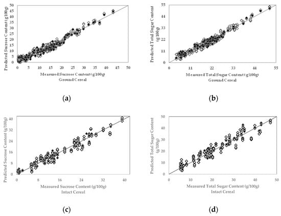 In most cases, the prediction model performance improved with a higher number of orthogonal latent variables or factors, since each factor explains variance in the model. However, including a redundant number of factors into a model may integrate the random noise or irrelevant components besides the relevant variance and reduce the model performance, which is called overfitting the model. Likewise, employing fewer factors than the optimal number, incorporating less variance than needed, is called underfitting []. The optimum number of factors that explain the required variance and give the minimum SECV ranged from 5 to 6. Correlation coefficient (R) of the model measures the strength of the relationship between measured and predicted sugar contents, and +1 indicates total positive linear correlation. SECV provides the possible error between measured and predicted values. All generated models had good performances in terms of high R and low SECV values (Table 2). Furthermore, the PLSR plots (Figure 3a–d) generated for the sucrose and total sugar content in ground and intact breakfast cereals display a good correlation between the measured reference values and predicted sugar content by FT-NIR sensor.