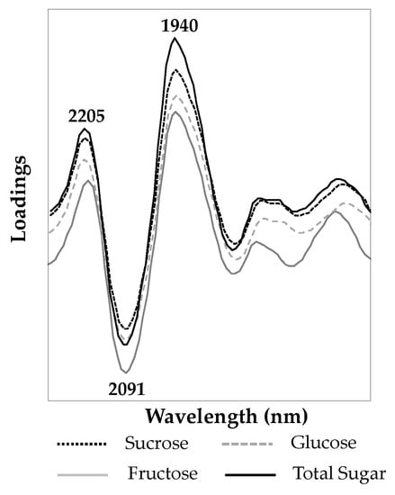 PLSR loading vectors reveal which bands are responsible for explaining the highest variation in the model and assist in understanding which functional groups account for the correlation in the regression model. The marker bands associated with the PLSR loading vectors for the first latent variable (factor) for the sucrose, glucose, fructose, and total sugar content in ground breakfast cereals, shown in Figure 4, indicated that the bands at 2205, 2091, and 1940 nm explained most of the variance in their corresponding PLSR models. The NIR bands located near 2205 nm correspond to C–H combination bands that are common to the various sugars []. As mentioned previously, bands centered at 2091 nm is associated with O–H combination stretching and H–O–H deformation of polysaccharides [,,], and the band at 1940 nm corresponds to O–H bending second overtone [,].
