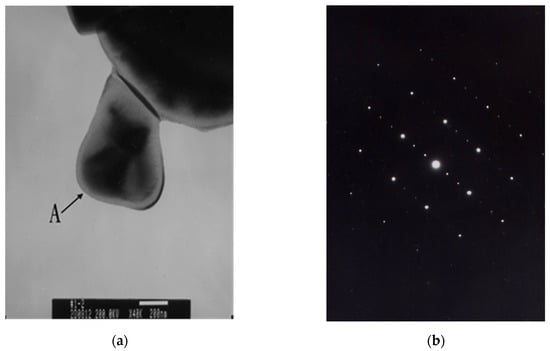 Transmission electron microscope (TEM) bright field image (a) and its corresponding selected area diffraction (SAD) pattern (b) of Phase A.
