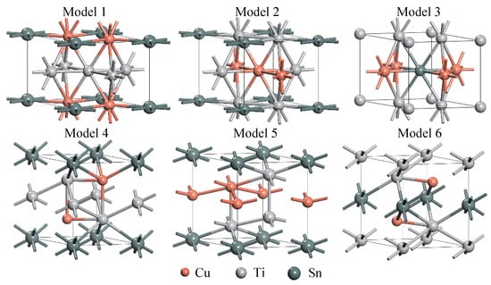 Models 1–6 showing the most favorable atomic structures. Red, gray, and dark green spheres represent Cu, Ti, and Sn atoms, respectively.
