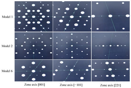Density functional theory (DFT) simulated SAD of Models 1, 2, and 6 along the [001], [−101], and [221].